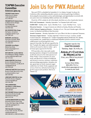 tcapwa.treasurer@gmail.com tennessee.apwa.org/event for the link. Tuesday, Sept. 10, 6-8 p.m.