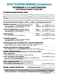 TCAPWA and mail to Mark Miller, P.O. Box 1350, Pigeon Forge, TN 37868 or register online at Tennessee.apwa.net. No invoices will be issued for fees.