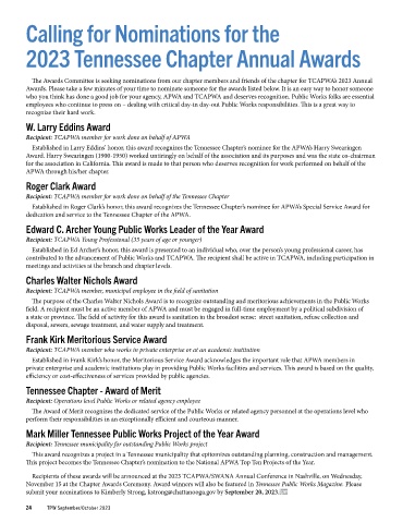 November 15 at the Chapter Awards Ceremony. Award winners will also be featured in Tennessee Public Works Magazine. Please