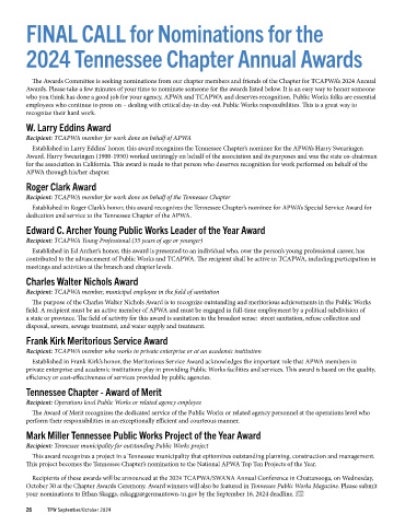 October 30 at the Chapter Awards Ceremony. Award winners will also be featured in Tennessee Public Works Magazine. Please submit
